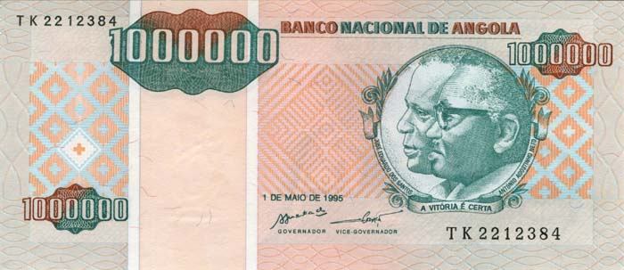 Лицевая сторона банкноты Анголы номиналом 1000000 Кванз Обратная сторона банкноты Анголы номиналом 1000000 Кванз