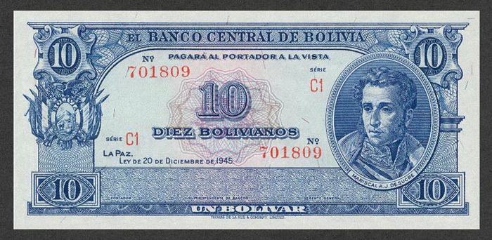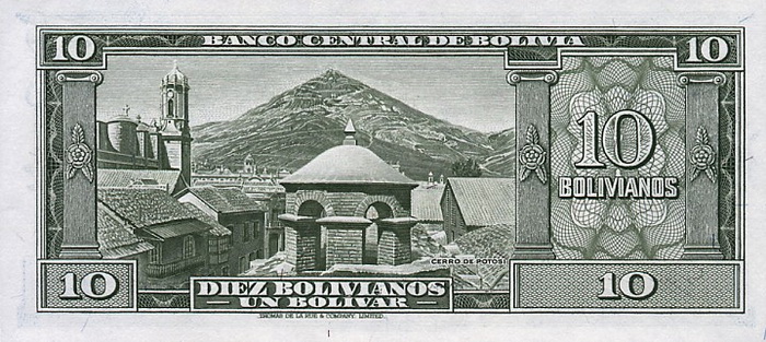 Лицевая сторона банкноты Боливии номиналом 10 Боливиано Обратная сторона банкноты Боливии номиналом 10 Боливиано