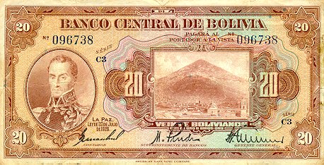 Лицевая сторона банкноты Боливии номиналом 20 Боливиано Обратная сторона банкноты Боливии номиналом 20 Боливиано