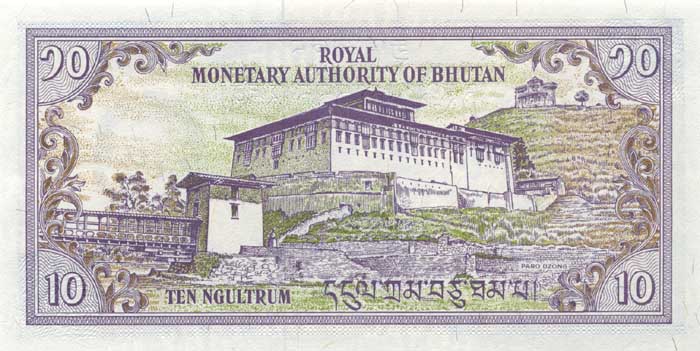 Лицевая сторона банкноты Бутана номиналом 10 Нгултрумов Обратная сторона банкноты Бутана номиналом 10 Нгултрумов