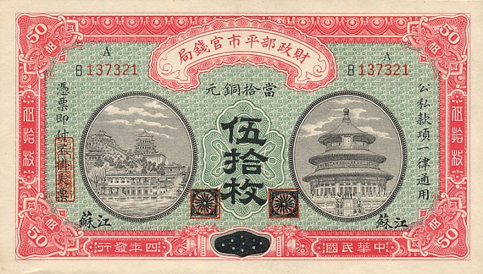 Лицевая сторона банкноты Китая номиналом 50 Копперов Обратная сторона банкноты Китая номиналом 50 Копперов