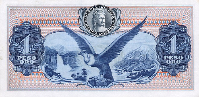 Лицевая сторона банкноты Колумбии номиналом 1 Песо Обратная сторона банкноты Колумбии номиналом 1 Песо