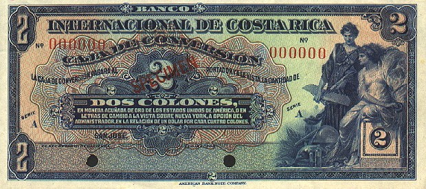 Лицевая сторона банкноты Коста-Рики номиналом 2 Колона Обратная сторона банкноты Коста-Рики номиналом 2 Колона