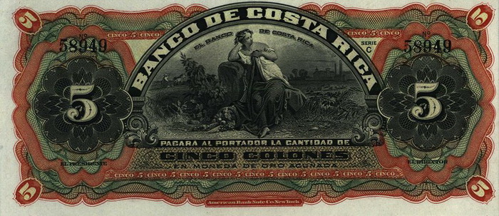 Лицевая сторона банкноты Коста-Рики номиналом 5 Колонов Обратная сторона банкноты Коста-Рики номиналом 5 Колонов