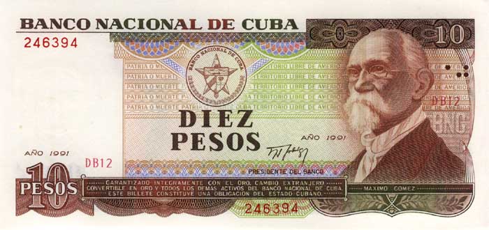 Лицевая сторона банкноты Кубы номиналом 10 Песо Обратная сторона банкноты Кубы номиналом 10 Песо