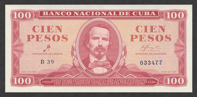 Лицевая сторона банкноты Кубы номиналом 100 Песо Обратная сторона банкноты Кубы номиналом 100 Песо