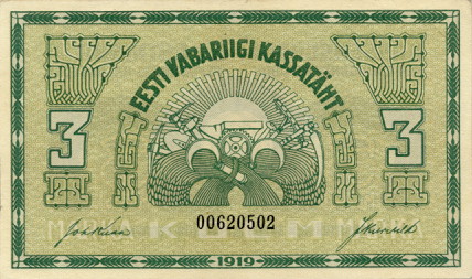 Лицевая сторона банкноты Эстонии номиналом 3 Марки Обратная сторона банкноты Эстонии номиналом 3 Марки