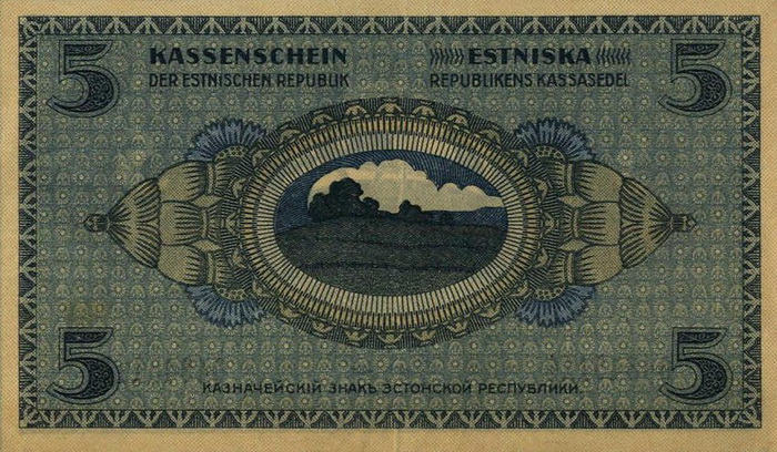 Лицевая сторона банкноты Эстонии номиналом 5 Марок Обратная сторона банкноты Эстонии номиналом 5 Марок