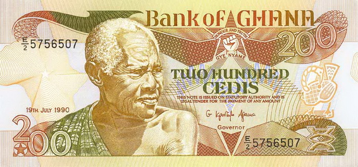 Лицевая сторона банкноты Ганы номиналом 200 Седи Обратная сторона банкноты Ганы номиналом 200 Седи