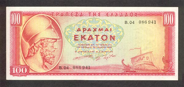 Лицевая сторона банкноты Греции номиналом 100 Драхм Обратная сторона банкноты Греции номиналом 100 Драхм