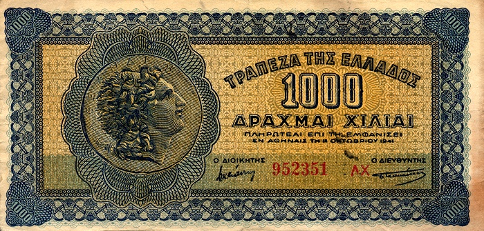 Лицевая сторона банкноты Греции номиналом 1000 Драхм Обратная сторона банкноты Греции номиналом 1000 Драхм