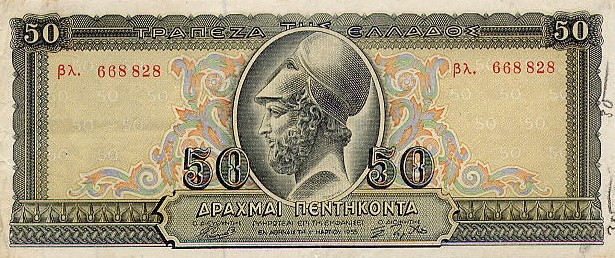 Лицевая сторона банкноты Греции номиналом 50 Драхм Обратная сторона банкноты Греции номиналом 50 Драхм