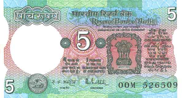 Лицевая сторона банкноты Индии номиналом 5 Рупий Обратная сторона банкноты Индии номиналом 5 Рупий