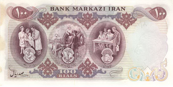 Лицевая сторона банкноты Ирана номиналом 100 Риалов Обратная сторона банкноты Ирана номиналом 100 Риалов