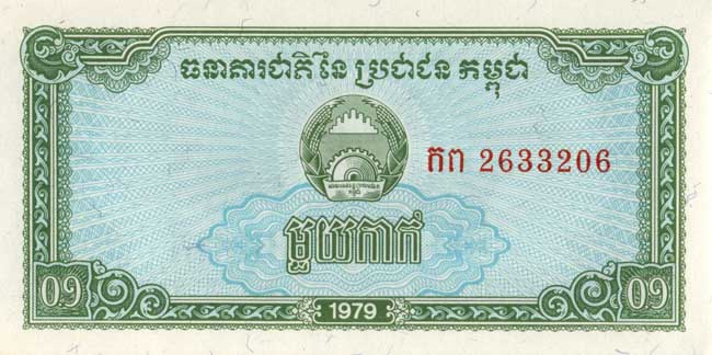 Лицевая сторона банкноты Камбоджи номиналом 1/10 Риеля Обратная сторона банкноты Камбоджи номиналом 1/10 Риеля
