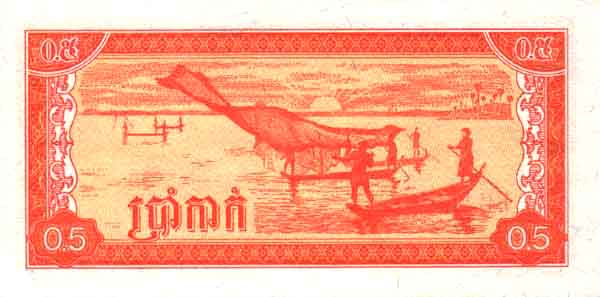 Лицевая сторона банкноты Камбоджи номиналом 1/2 Риеля Обратная сторона банкноты Камбоджи номиналом 1/2 Риеля