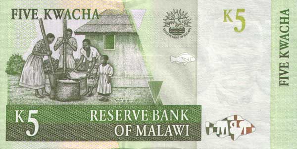 Лицевая сторона банкноты Малави номиналом 5 Квач Обратная сторона банкноты Малави номиналом 5 Квач