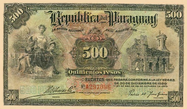 Лицевая сторона банкноты Парагвая номиналом 500 Песо Обратная сторона банкноты Парагвая номиналом 500 Песо