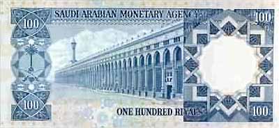 Лицевая сторона банкноты Саудовской Аравии номиналом 100 Риялов Обратная сторона банкноты Саудовской Аравии номиналом 100 Риялов