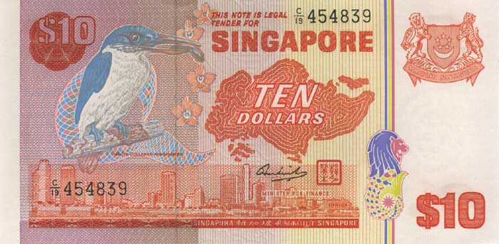 Лицевая сторона банкноты Сингапура номиналом 10 Долларов Обратная сторона банкноты Сингапура номиналом 10 Долларов