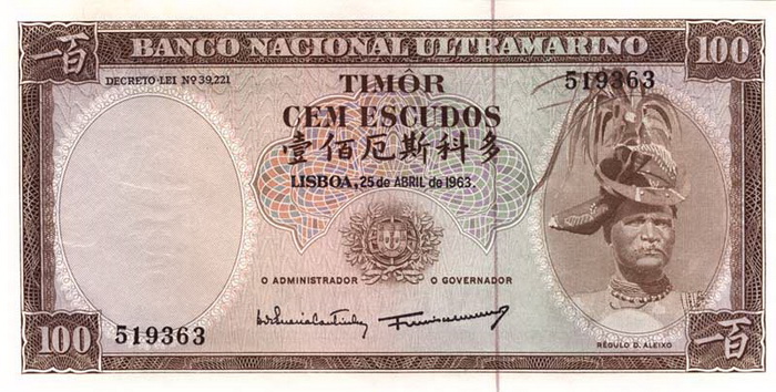 Лицевая сторона банкноты Восточного Тимора номиналом 100 Эскудо Обратная сторона банкноты Восточного Тимора номиналом 100 Эскудо