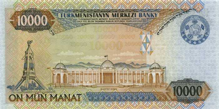 Лицевая сторона банкноты Туркменистана номиналом 10000 Манатов Обратная сторона банкноты Туркменистана номиналом 10000 Манатов
