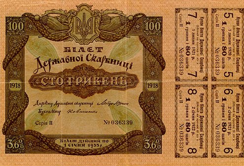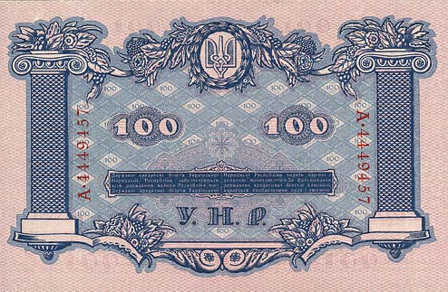 Лицевая сторона банкноты Украины номиналом 100 Карбованцев Обратная сторона банкноты Украины номиналом 100 Карбованцев