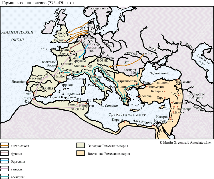 главная / исторические карты / Германия / Германское нашествие, 375—450 н.э.